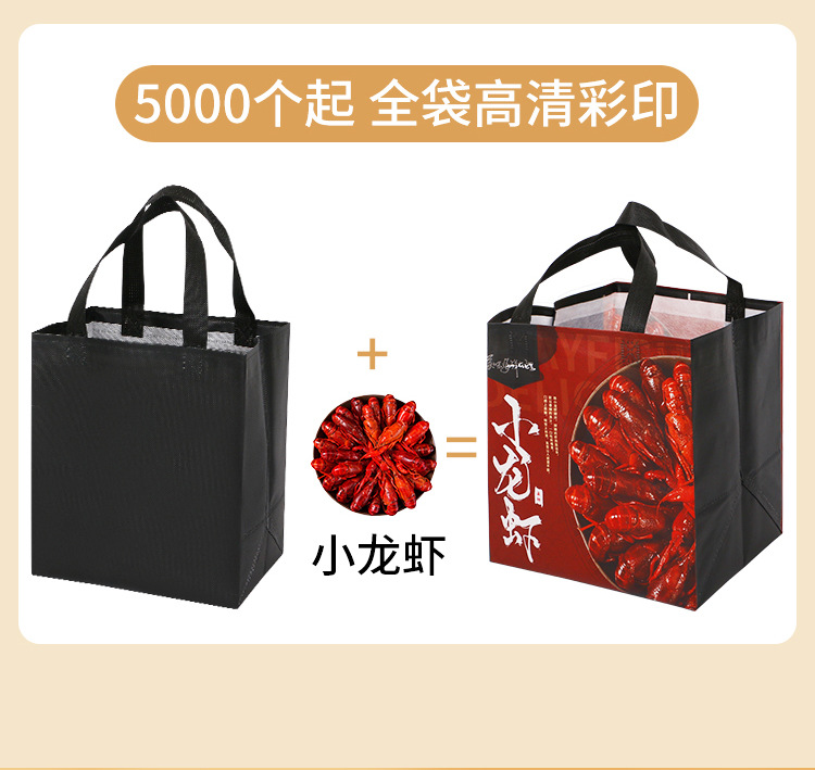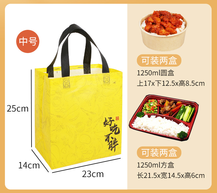 广告宣传:无纺布覆膜外卖袋可以作为商家的广告宣传工具,客户可以在袋子上印上自己的品牌LOGO或宣传语,增加品牌曝光率。